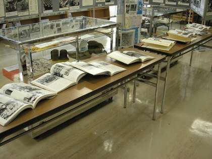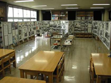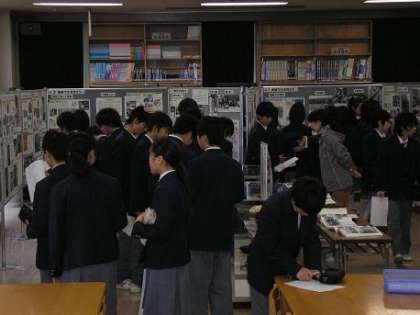 図書館開館時や、1・2年生は学級活動の時間などに時間をとって見学をしています。写真や実物の展示に、生徒たちも見入っています。