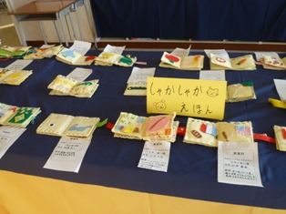 写真は2年生の作品です。写真左から美術「粘土による野菜・果物」、技術「金属加工」、家庭科「しゃかしゃか絵本」です。