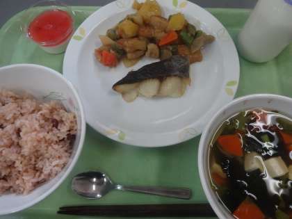 卒業をお祝いして、赤飯や紅白の2色ゼリーを提供しました。