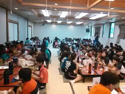 昼食時間です。みんなお腹がすいているようで、おいしそうに食事をしています。12時15分から午後の練習が始まります。