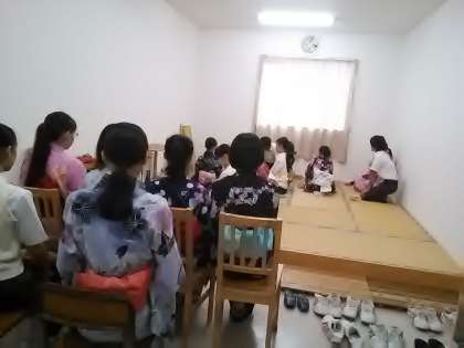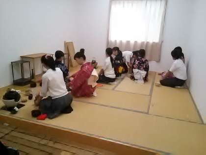 多くの部活動がお盆休みで活動中止の中、茶道部は茶道の先生をお招きして、集中練習をしています。夏休みの練習は、浴衣を着て着物着用のイメージで練習しています。静寂の中、背筋を伸ばして練習に取り組む茶道部員の姿が印象的です。