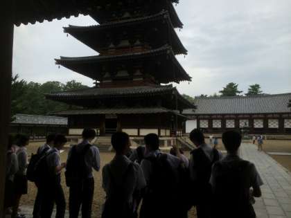 新大阪駅からバスで法隆寺に到着しました。これからガイドさんのお話を聞きながら一時間程クラス行動で見学をします。