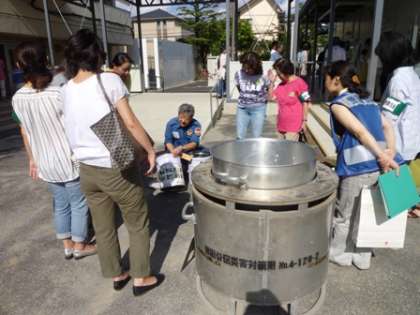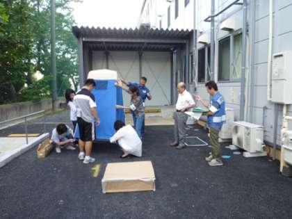 避難所運営訓練マニュアルの読み合わせの後は、実際に班別に防災倉庫から防災用品を取り出して、ガスバーナーで火をおこしたり、仮設トイレを設置する等の動きをしてみました。備えあれば憂いなし。みなさん真剣に訓練に取り組んでいました。