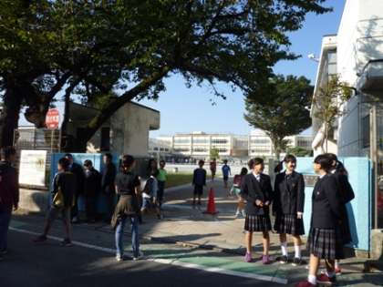 学び舎の活動の一環として行われている「ふれあい挨拶運動」は、毎月1回、クラスごとに学び舎小学校の校門付近で挨拶運動を行っています。2年1組から始まり、今月からは1年生の担当となりました。昨年まで通っていた小学校の校門の前に立ち、1年1組の生徒が、元気よく『おはようございます!』と、小学生に呼びかけていました。