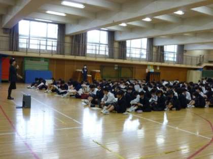 定例で行われている2年生学年集会。今日は、11月27日(金)に行われる校外学習に向けて、学年全体でプリントを使った事前学習を行いました。校外学習で訪れる『下町』とは、東京の一体どの地域を指すのか、いつ頃からそう呼ばれるようになったのか、先生から説明を受け、みんな納得。また『あなたは江戸っ子になれるかチェック』は、「これは無理!」「これは当てはまる!」等、声をあげ、興味深そうに取り組んでいました。今後は、学年のルールを決めたり、班行動計画を立てたりしていきます。