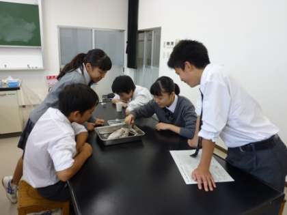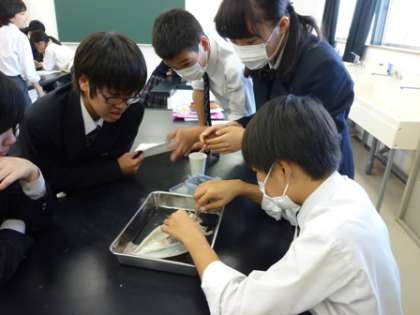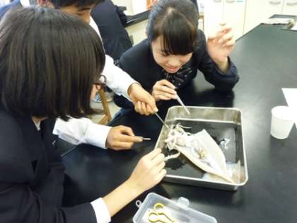 各班に一杯ずつ配られたイカを、解剖ばさみやピンセットで解剖していきます。まずは足の数を確認するなど外観の観察をした後、内臓の観察、口器、眼球の観察へと進んでいきます。生徒たちは「わぁ、触れないよ」「こんなふうになっているんだ…」と声をあげながら、真剣に解剖に取り組んでいました。