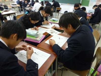 昨日の無セキツイ動物(イカ)の解剖に続いて、今日はセキツイ動物の体のつくりやはたらきを調べる目的で、カタクチイワシのにぼしを解剖しました。10センチ度の大きめなにぼしを、一人一匹ようじを使って解剖していきます。教室中に、にぼしで『だし』をとるときのようないいにおいが漂っていました。