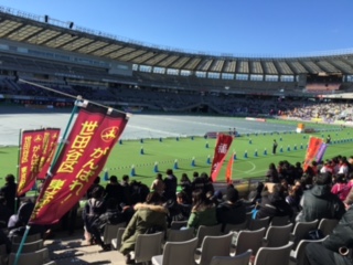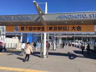 青空の下、調布味の素スタジアムを会場にして、第7回中学生東京駅伝大会が行われています。午前中女子の部は、第10位、現在男子の部が行われています。深中からも、2年生2人が出場しています。現在13番めの走者がスタートしていきました。世田谷チームは、現在13位です。