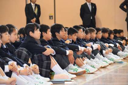 全校生徒が集まり、部活動オリエンテーションを行いました。新入生にどんな活動をしている部なのか、紹介するためです。2・3年生がしっかり準備をしていたため、時間通りスムーズに進みました。1年生は先輩たちの姿に見入っていました。