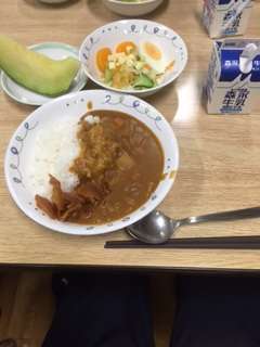 本日のメニューはカレーライス、サラダ、メロン、牛乳でした。しっかりと食べて、明日に向けて元気の補給です!