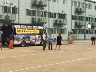 トラックの内輪差の検証です。生徒代表がトラックの内輪差を体感しました。