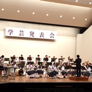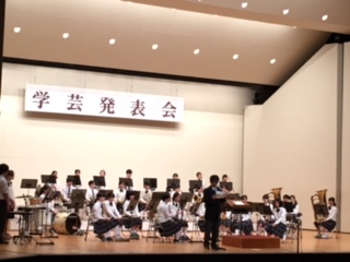 学芸発表会が始まりました。委員長の話に続いて吹奏楽部の演奏です。ホールに音が響きわたります。