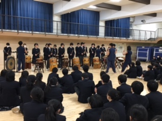 深沢高校和太鼓部のみなさんを招いて3年生対象に訪問授業が行われています。始めに模範演奏をしていただき、その迫力に圧倒されました。その後は、グラスごとに太鼓の体験授業です。太鼓の音がお腹に響きます。