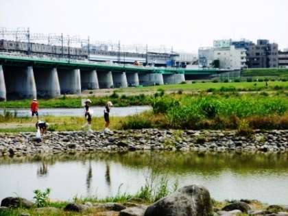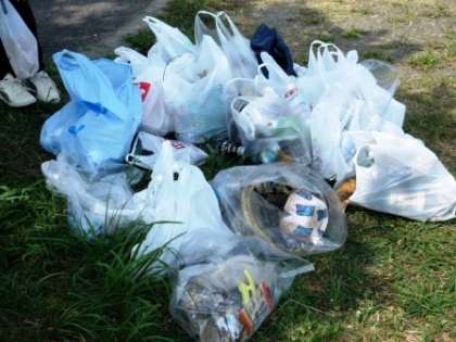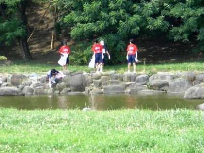 さらに、午後は毎年恒例、生徒会主催の「多摩川クリーニング」が行われ、25名の生徒が参加しました。35度という暑さの中、一生懸命拾い集めたゴミは、たった40分程度で写真にある量に。生徒からは「タバコの吸殻多いよね…」「ペットボトルも多いよ…」という声が聞かれました。