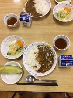 本日の夕食はカレーライス、サラダ、メロン、牛乳です。