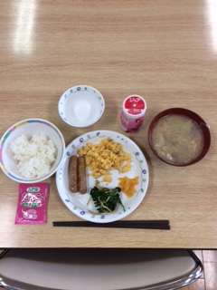 今朝のメニューは、しらす入り卵焼き、ウインナー、ほうれん草のおひたし、味噌汁、ジョアです。