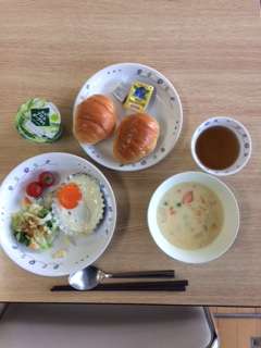 朝食のメニューは、ベーコンエッグ、サラダ、ホワイトシチュー、バターロール、アロエヨーグルトです。