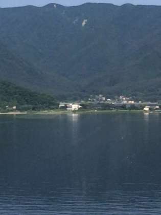 河口湖大橋から見た河口湖学園(白い建物)です。3日間お世話になりました。