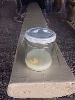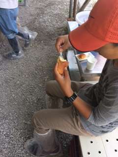 ミルクをシェイク、出来たバターを米粉パンにつけて食べます。