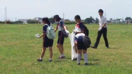 有志の生徒と本部役員で多摩川河川敷の美化活動に取り組んでいます。