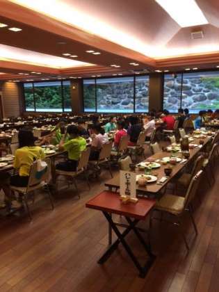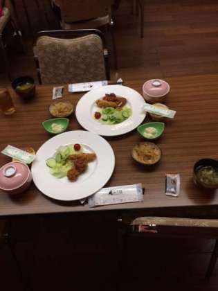 今夜の夕食です。唐揚げとエビフライなどです。この後、男女ソフトテニス部とサッカー部は夜練に行きます。タフですね〜!みんな頑張れ!