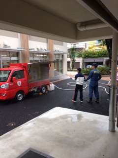 本校、改築のため一時実施出来なかった避難所運営訓練を3年ぶりに行いました。訓練内容は、避難者の受付、無線交信訓練、受水槽の停止、立ち入り禁止区域の表示、アルファ米炊出し、まちかど防災訓練車による消火体験などです。参加者は各町内会など地域の方、本校PTA、中学生もテスト前ですが4名参加して、総勢60名で実施しました。皆様ご協力ありがとうございました。