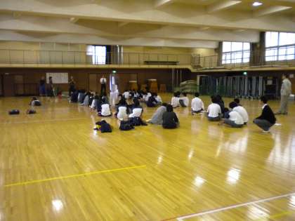 10月5日に区立総合運動場で連合陸上大会が行われました。深沢中からも3学年男女で合計47人が、100m、200m、800m、1500m、100mハードル、80mハードル、400mリレー、幅跳び、高跳び、砲丸投げの各種目に参加しました。練習では雨の日が続き、満足な練習ができなかったかもしれませんが、全選手が自己記録を少しでも更新するよう健闘しました。(写真は前日の直前の説明の様子)