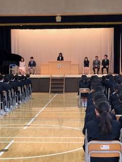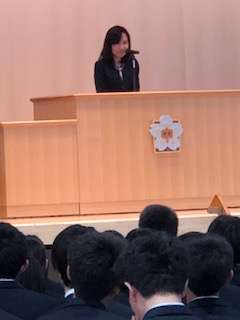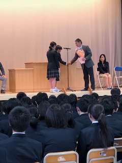 お世話になった先生方に、代表の生徒が感謝の言葉と花束をプレゼントしました。卒業式にはまた、成長した私たちの姿を見に来て下さいと言う言葉が印象的でした。