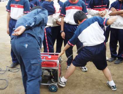 11月25日、本校では、避難所運営訓練が行われました。地域や消防署の方のご指導のもと、1年生は災害時に必要な知識を身につける体験学習を行いました。A・B・Cの三グループに分かれ、バーナー体験・発電機の作動体験・応急救護体験に参加しました。その後保護者による「AED」の演示がおこなわれ、1年生の代表2名が実際に体験しました。校長先生から、「実際に災害が起きた時、地域を守るのは君たちです。」というお話がありました。是非今回の学習をこれからの生活に生かしてほしいと思います。