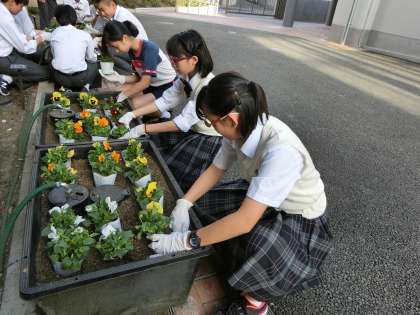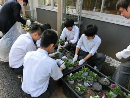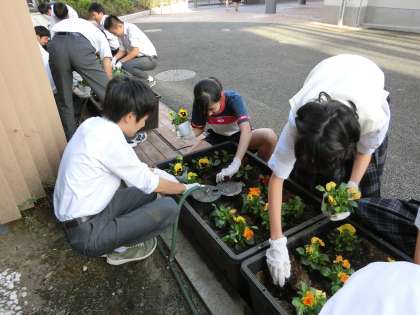 生徒会役員の呼びかけでボランティアが集まり、正門から中庭に向かう途中にあるプランターへパンジーの苗を植える活動を行いました。参加者は、主事さんたちのご指導のもと、和やかに作業を行っていました。