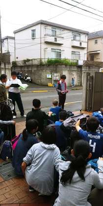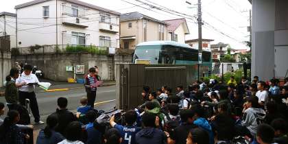 1年生の河口湖移動教室の開校式が終わりました。まだ、バスが1台しか到着しておらず、全員待機しています。