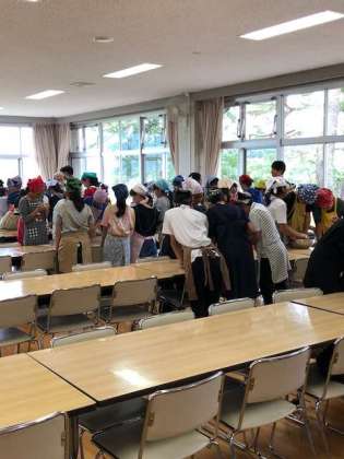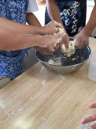 今晩の夕食のひと品となる、うどん作りです。かなり力が必要で掛け声とともにこねる女子、拳で連打する男子と珍しいうどん作りも見られました。