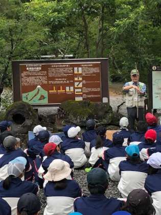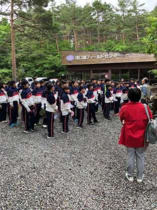 移動教室2日目、河口湖フィールドセンターでフィールドワーク(溶岩樹型探検)です。