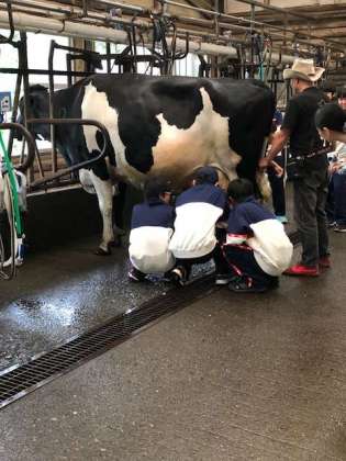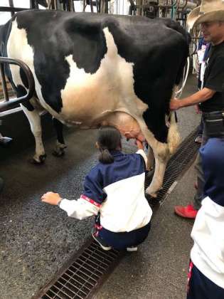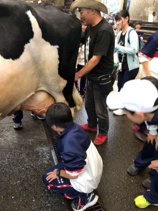 乳搾り体験中、みんな上手にできました。最後に体験した動物嫌いの先生は牛小屋の外まで届く大きな声で “?ぁっ!” と叫んでいました。