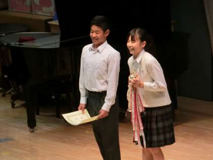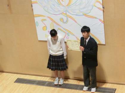 表彰の様子と、美術部が制作したスローガン「輝翼〜リズム〜」イメージ画の前で記念撮影の様子です。