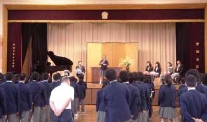 本校を離任することになった先生方をお招きして、離任式が行われました。お世話になった生徒から作文と花束を贈り、離任された先生方にお話をしていただきました。
