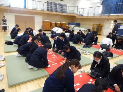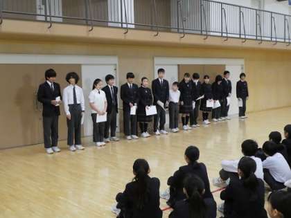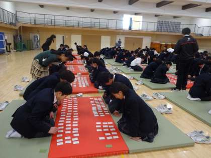 2年生に続いて、1月31日(金)6時間目、1年生も百人一首大会を行いました。中学生になって初めての百人一首大会でしたが、大いに盛り上がりました。表彰されて嬉しそうな表情を見せた様子も1年生らしく、来年はもっとたくさんの句を覚えようと思った人も多かったようです。