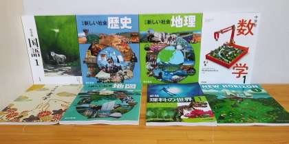 1年生の教科書は、全教科が配布されるので、非常に多くなります。参考までに写真を添付します。教科書以外には、茶封筒(副教材2冊と学校だより・課題プリント等が入ったもの)と青い封筒の2つがあります。大きめのカバンやリュックサックを複数ご持参ください。検温もお忘れなく、よろしくお願いいたします。