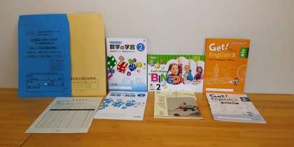 参考までに、配布する教科書と副教材・プリント等を添付します。大きなリュックサックやカバン、健康観察表の持参をお忘れなく。