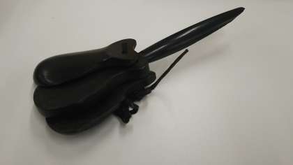 写真を見てください。皆さんには、小学校の頃赤と青のものを使った経験も多いと思います。この楽器の形は色々あります。木と木を合わせた音がします。スペインのフラメンコで使われたのが有名です。さあ❗️名前はわかりましたか?
