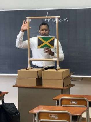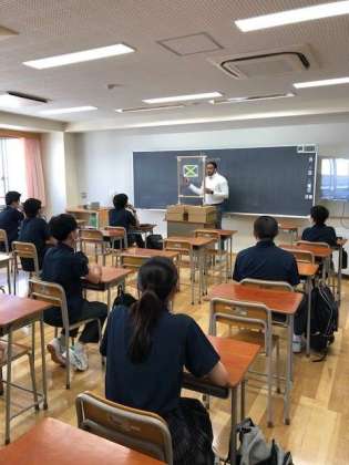 新型コロナウイルス感染症の感染防止のため授業でもマスクは必須ですが、英語の授業でALTの先生の発音を学ぶためには、口の形や発音の仕方を見ることはとても重要です。そのため、安倍首相の横で手話通訳をしている方の前にあった「飛沫防止パーテーション」をヒントに自作のパーテーションを作ってみました。材料はアクリル板(廃品利用)と模造紙の芯の紙パイプと養生テープです。ALTの先生の表情や口の形をしっかり見ることができ、作った甲斐がありました。ALTのAkeem先生が長身のため段ボールの下駄をはかせています。 (副校長 新妻弘樹)