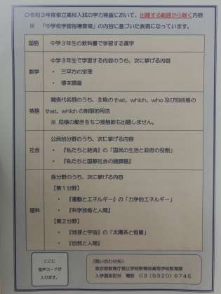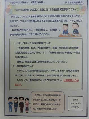 既に、新聞等でも報道されておりますが、「中学校等の臨時休業の実施等を踏まえた 令和3年度東京都立高等学校入学者選抜等における配慮事項について」の全文を掲載いたします。7月中旬には、この内容が紙媒体で配布される予定です。
