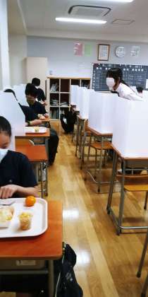 机の消毒から手洗いも丁寧に距離を保ち、完璧に行ってから、配膳された給食を受け取ります。