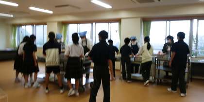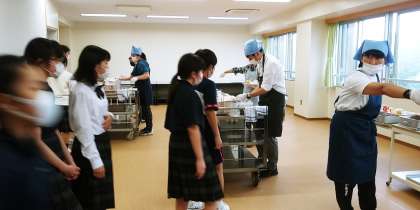1年生は、教室の幅が狭いので、多目的室で配膳しました。