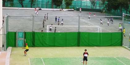 また、校庭では3つの部活動が練習しています。手前から、男子ソフトテニス部、サッカー部、野球部(奥で見ずらいと思いますが)の練習風景です。