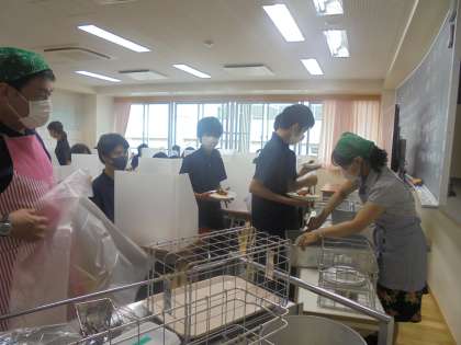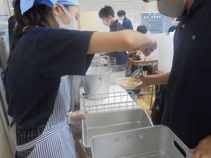 2年生も同じく「おかわり」の対応に当番生徒が頑張って対応していました。中には、ゼリーを食缶から必死にすくい上げている当番さんや、先生がきっちり残さずよそっているクラスもありました。
