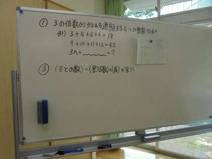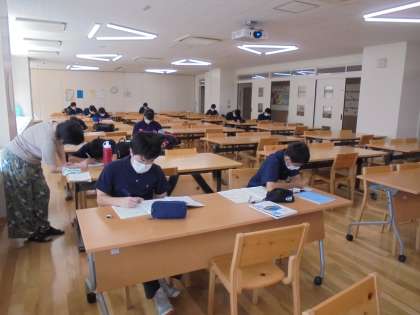 2年生の待ち時間は、ランチルームです。大勢が自習に取り組み、3時間目に備えています。1時間目の数学課題が示されていました。