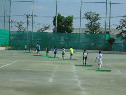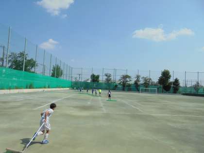 この夏一番の暑さの中、校庭ではサッカー部が走り回っています・・・と思いきや、練習が終わりかけの校庭整備のショットとなってしまいました。整備状況が整然としていますね。