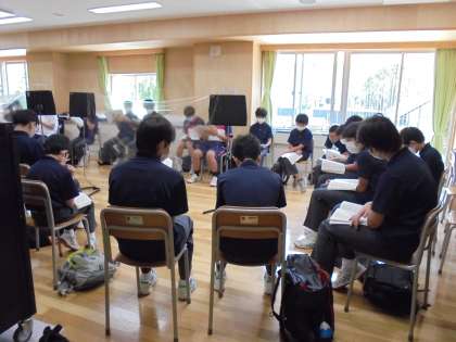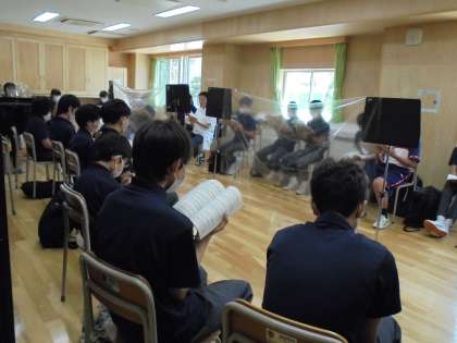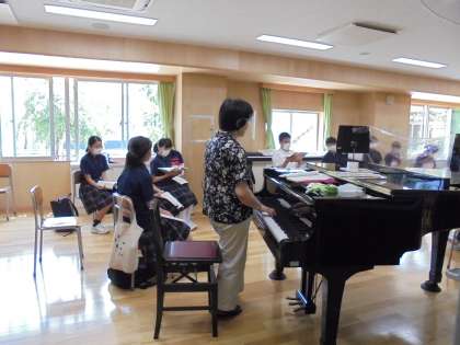2年生は、音楽室で合唱に挑戦。音楽室の中央には、透明なシールドを設置しています。男声パートには、北沢先生の力強い歌声が加わり「時の旅人」を歌い込みました。
