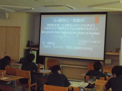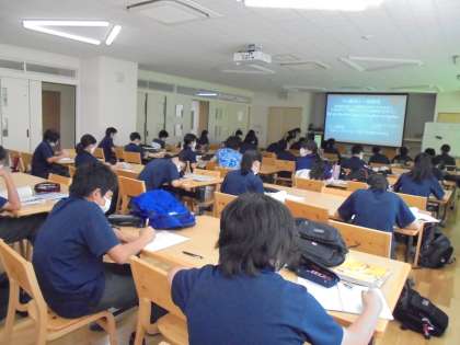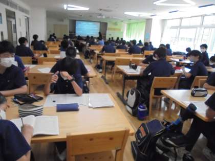 2年生の英語は、ランチルームの後ろ2列の机には対面で各自の課題に取り組むグループが、黙々と作業に励んでいました。